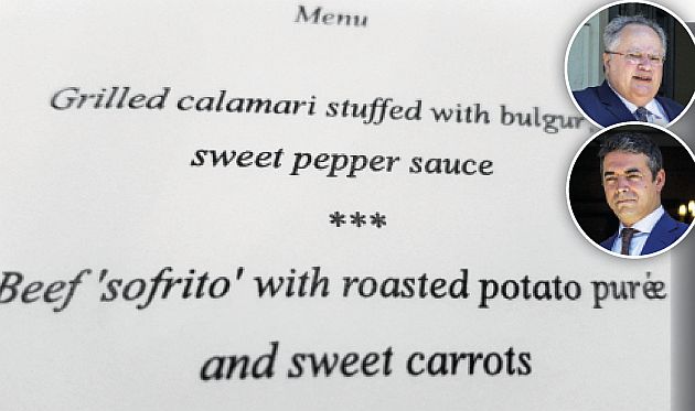 Καλαμάρι σε γλυκιά πιπεράτη σος για αρχή και σοφρίτο με καρότα για τη συνέχεια. Αυτό είναι το μενού που απόλαυσε χθες στο γεύμα που δόθηκε από τον ομόλογό του Νίκο Κοτζιά (μικρή φωτό πάνω) ο Σκοπιανός υπουργός Εξωτερικών Νικολά Ντιμιτρόφ (μικρή φωτό κάτω). Οι δύο υπουργοί συζήτησαν τα θέματά τους, συνοδεία λευκού μοσχοφίλερου.