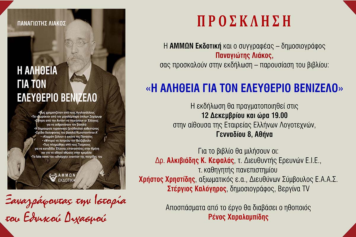 Ο δημοσιογράφος – συγγραφέας Παναγιώτης Λιάκος και η «ΑΜΜΩΝ» εκδοτική σας προσκαλούν στην παρουσίαση του αποκαλυπτικού βιβλίου «Η αλήθεια για τον Ελευθέριο Βενιζέλο».