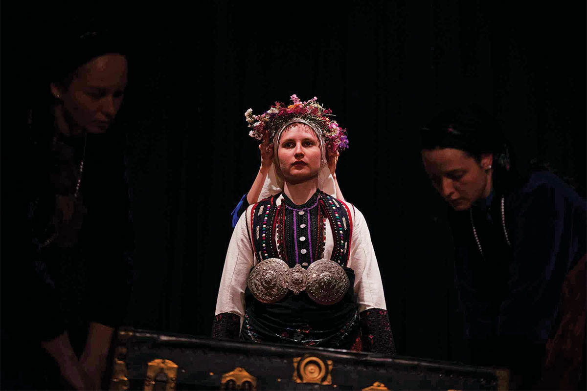 Αξίζει να σημειωθεί ότι το υλικό του έργου αντλήθηκε από συνεντεύξεις και μαρτυρίες γυναικών της δυτικής Μακεδονίας. Με «όχημα» τη ζωντανή παραδοσιακή μουσική, το σύγχρονο δυστοπικό ηχοτοπίο, τον χορό και την παραδοσιακή φορεσιά, αναβιώνουν επί σκηνής οι γυναικείες ιστορίες προηγούμενων γενιών σε μια παράλληλη αφήγηση των σταδίων της τελετουργίας του γάμου. Η φορεσιά ως σύμβολο ανακλά την ιστορία και τον πολιτισμό του τόπου από τον οποίο προέρχεται, καθώς έχει μια έντονη σύνδεση με τη γυναικεία ταυτότητα, την ιστορία και τη θέση των γυναικών στο κοινωνικό σύνολο.