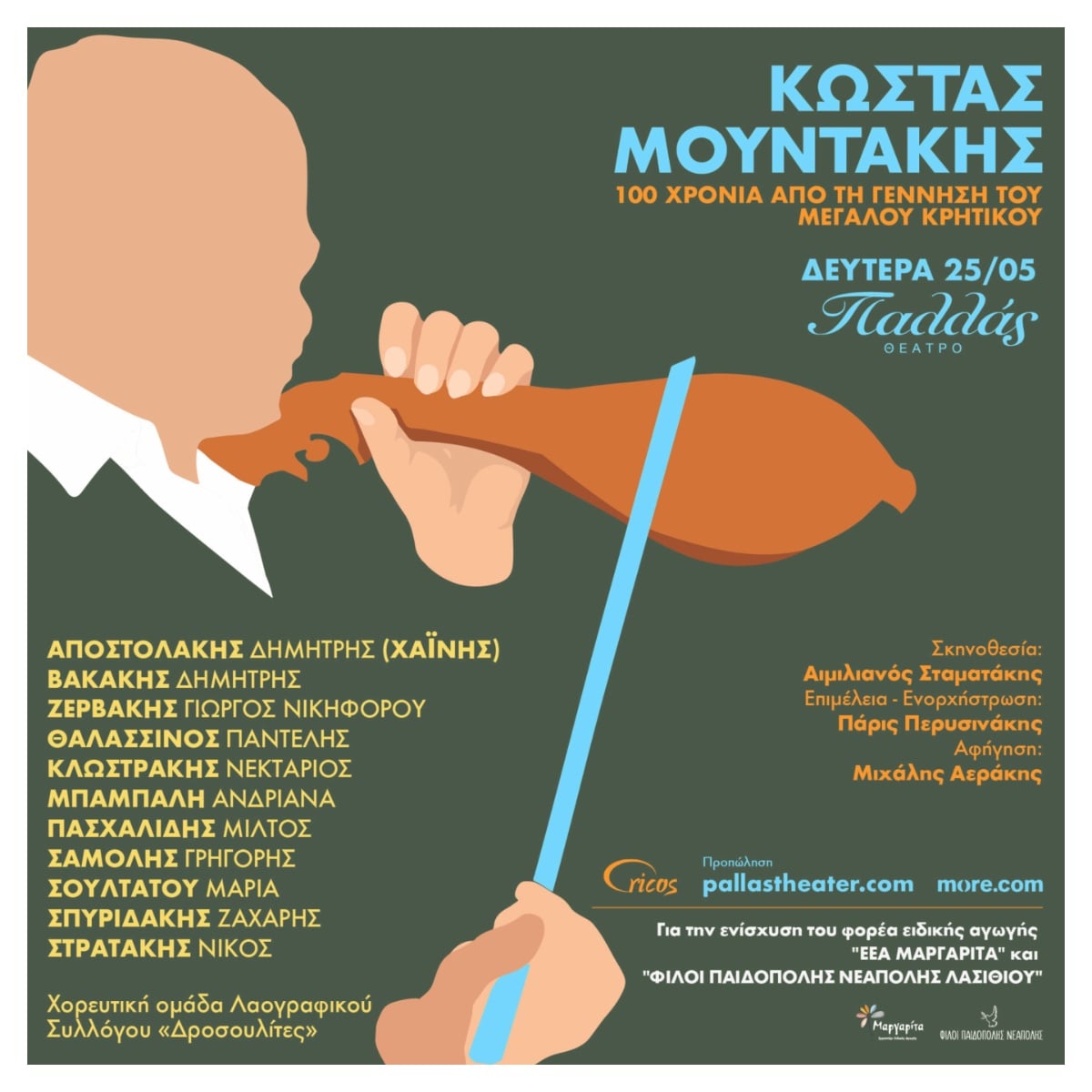 Μια ξεχωριστή βραδιά γεμάτη συγκίνηση, μνήμη και αυθεντική κρητική μουσική έρχεται να τιμήσει τον σπουδαίο συνθέτη και λυράρη Κώστα Μουντάκη, τη Δευτέρα 25 Μαΐου 2026 στο Θέατρο Παλλάς, στις 8.30 μ.μ.