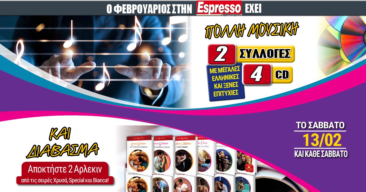 Το Σάββατο 13.02 και κάθε Σάββατο αποκτήστε 2 συλλογές (4CD) με μεγάλες ελληνικές και ξένες επιτυχίες!