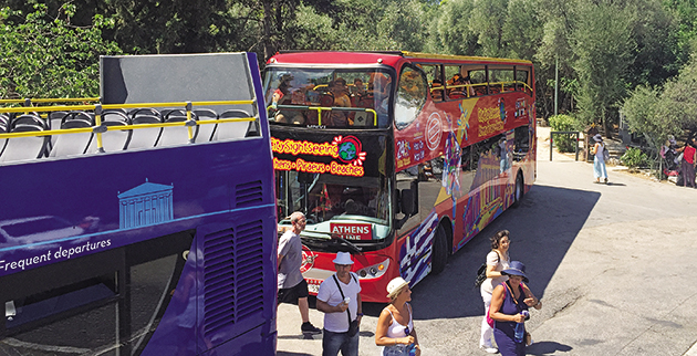 Ανηφορίζουμε τον δρόμο και το γνώριμο κόκκινο λεωφορείο σταματά στην επιβλητική Ακρόπολη. «Οσοι θέλουν να μεταβούν προς τον Πειραιά και τη Γλυφάδα ας επιβιβαστούν τώρα στο μπλε λεωφορείο» ακούγεται να λέει μία ξεναγός. Οι περισσότεροι τουρίστες κατεβαίνουν για να επισκεφθούν την Ακρόπολη, ενώ αρκετοί ανεβαίνουν για να επιστρέψουν στο κέντρο της πρωτεύουσας.