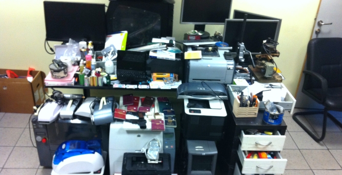 Σύμφωνα με την επίσημη ανακοίνωση της Αστυνομίας, στο σπίτι στην περιοχή του Πειραιά βρέθηκε και κατασχέθηκε ένα πλήρες εργαστήριο κατασκευής πλαστών εγγράφων, αποτελούμενο από δύο ηλεκτρονικούς υπολογιστές, έναν φορητό ηλεκτρονικό υπολογιστή, τέσσερις οθόνες, δεκαέξι εσωτερικούς σκληρούς δίσκους, έναν εξωτερικό σκληρό δίσκο, επτά ψηφιακούς εκτυπωτές, δύο πολυμηχανήματα, ένα μηχάνημα εντύπωσης πλαστικών καρτών, ένα ειδικό ψηφιακό μηχάνημα εγχάραξης επιφανειών, τέσσερα μηχανήματα θερμοκόλλησης, τέσσερις φορητές κάρτες μνήμης και ένα USB.