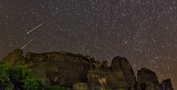 Ενα υπερθέαμα είχαν την ευκαιρία να απολαύσουν όσοι ξενύχτησαν το βράδυ της Δευτέρας, καθώς μια φωτεινή βροχή από διάττοντες αστέρες -οι Περσείδες- έσκιζε επί ώρες τον σκοτεινό ουρανό. Μάλιστα, το αστρονομικό φαινόμενο απαθανατίστηκε σε μια εκπληκτική φωτογραφία από τα επιβλητικά Μετέωρα, η οποία έκανε τον γύρο του κόσμου μέσα από την ιστοσελίδα της NASA.