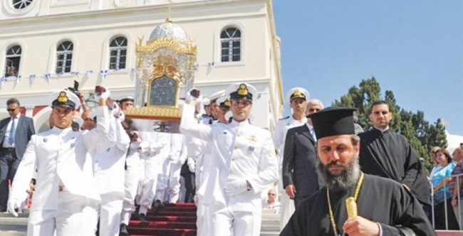 Τα γιορτινά της φόρεσε χθες η Τήνος, καθώς χιλιάδες πιστοί από κάθε γωνιά της Ελλάδας -και όχι μόνο- παρευρέθηκαν στον ναό της Ευαγγελίστριας προκειμένου να αγγίξουν και να ασπαστούν τη θαυματουργή εικόνα της Παναγίας. Η τελετουργική κάθοδος της εικόνας από τον ναό στην κεντρική εξέδρα της παραλίας πραγματοποιήθηκε υπό τους ήχους των εμβατηρίων που παιάνιζε η μπάντα του Πολεμικού Ναυτικού, ενώ την ίδια στιγμή οι πιστοί έψαλλαν το «Τη Υπερμάχω». Στη λιτανεία της θαυματουργής εικόνας της Παναγίας της Τήνου βρέθηκαν πολλοί ιεράρχες, οι επικεφαλής των τριών Οπλων, καθώς και εκπρόσωποι όλων των κοινοβουλευτικών κομμάτων.