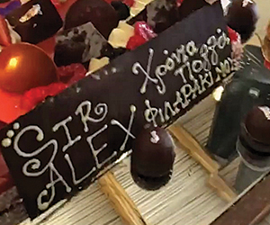 καμαρώνει γελώντας και να χειροκροτεί. Οσο για τη γενέθλια τούρτα του; Πιθανότατα την παρήγγειλε ο Σέρος, αφού έγραφε πάνω «Sir Alex! Χρόνια πολλά φιλαράκι μου».