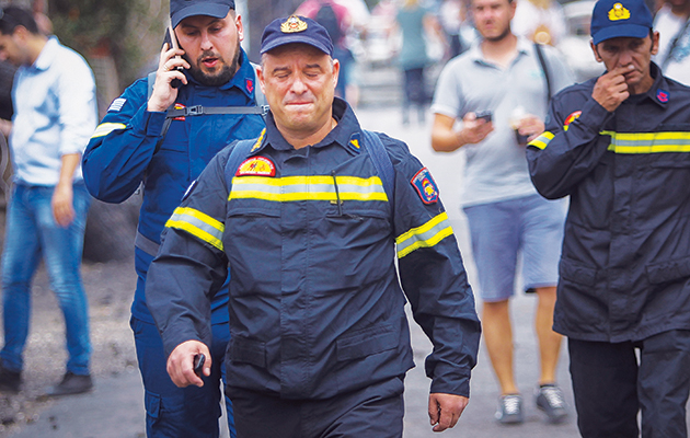 Εικόνες που κάνουν ακόμη και τους πιο ψύχραιμους να λυγίσουν. Η υπερπροσπάθεια, η κόπωση και το άγχος για να προστατέψουν τους συνανθρώπους τους, τις περιουσίες όσων βλέπουν τις φλόγες να πλησιάζουν τα σπίτια τους, αλλά και τα δάση που είναι ανυπεράσπιστα απέναντι στην πύρινη λαίλαπα αποτυπώνονται στον φωτογραφικό φακό. Οι ήρωες πυροσβέστες βγαίνουν από τη μάχη με τη φωτιά για να κάνουν μικρά διαλείμματα για λίγο νερό, ακόμα και για να φροντίσουν τα αμέτρητα χτυπήματα και εγκαύματα που έχουν στο σώμα τους, και έπειτα ρίχνονται και πάλι στη μάχη.