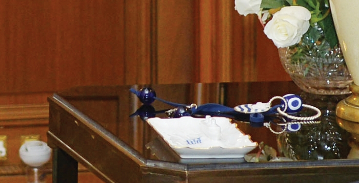Ενα μεγάλο γαλάζιο μάτι, «φύλακας από τη βασκανία και τη γλωσσοφαγιά», κοσμεί εδώ και αρκετό καιρό το τραπεζάκι που βρίσκεται δίπλα στον πολυφωτογραφημένο καναπέ όπου κάθονται οι προσκεκλημένοι του πρωθυπουργού και αριστερά της πολυθρόνας όπου κάθεται ο οικοδεσπότης. Θα μπορούσε να είναι το… φετίχ του Μαξίμου, αλλά σαφέστατα είναι ένα ωραίο, προσεγμένο κομμάτι, σίγουρα δώρο από «καλό χέρι». Το… φετίχ του γραφείου του πρωθυπουργού αποτελείται από δύο ασημένιους κρίκους (έναν μικρό κι έναν μεγάλο) που δένουν αρμονικά ο ένας με τον άλλον και στηρίζονται σε ένα μεγάλο μπλε μάτι. Ο ένας από τους δύο κρίκους στο τελείωμά του δένει με μια μικρή πλάκα με ωοειδές σχήμα στα χρώματα της ελληνικής σημαίας, μπλε και άσπρο, ενώ πάνω του είναι ένας μεγάλος ασημένιος σταυρός. Στην άλλη άκρη το φυλαχτό καταλήγει σε δύο μπλε πέτρες. Το συγκεκριμένο φυλαχτό βρίσκεται σε περίοπτη θέση στον χώρο όπου ο πρωθυπουργός φωτογραφίζεται πάντα με τους επίσημους καλεσμένους του. Είναι πάντα εκεί στο τραπεζάκι προκειμένου να «προστατεύει» από την αρνητική ενέργεια. Εξάλλου το «μάτιασμα» είναι αποδεκτό και από την Εκκλησία. Η πίστη στο «κακό μάτι» έχει τις ρίζες της στην αρχαιότητα και είναι μία από εκείνες τις παλαιές πεποιθήσεις που δεν πέθαναν στο πέρασμα του χρόνου.
