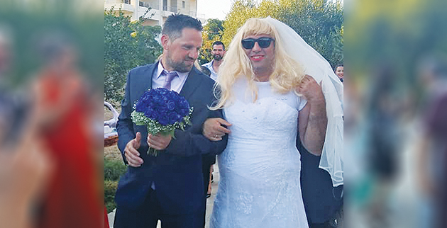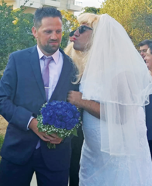 Μάλιστα, η άγνωστη ξανθιά με τα μαύρα γυαλιά άρπαξε από το μπράτσο τον κεραυνοβολημένο γαμπρό και άρχισε να τον σέρνει για να τον βάλει κακήν κακώς στην εκκλησία. Ο «άτυχος» άνδρας δεν άργησε, βεβαίως, να διαπιστώσει πως κάτω από το λευκό πέπλο κρυβόταν ο συνάδελφός του από τη Διαδημοτική Επιχείρηση Διαχείρισης Στερεών Αποβλήτων (ΔΕΔΙΣΑ) Φάνης Πετράκης, ο οποίος του έκανε πλάκα, με αποτέλεσμα να ξεσπάσει σε γέλια. Μάλιστα, υπέκυψε στις πιέσεις των καλεσμένων και έδωσε ένα αθώο φιλί στον φίλο του, μπροστά στην εκκλησία!