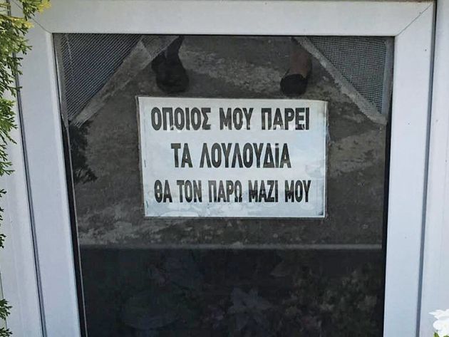 «Οποιος μου πάρει τα λουλούδια θα τον πάρω μαζί μου» αναφέρει προειδοποιητικά η συγκεκριμένη επιγραφή, που δείχνει ότι η οικογένεια τοποθετεί συχνά φρέσκα λουλούδια και γλάστρες γύρω από το μνήμα, αλλά διαπιστώνει ότι κάνουν… φτερά, καθώς τα κλέβουν κάποιοι επιτήδειοι για να στολίζουν τους τάφους δικών τους!