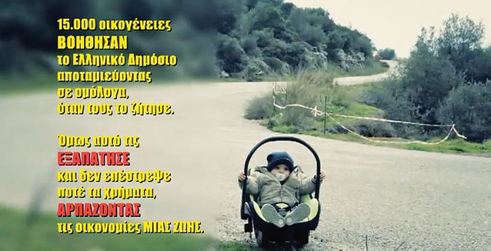 Την αγανάκτηση και την αδικία που νιώθουν κατάφεραν να εκφράσουν μέσα από ένα συγκλονιστικό σποτ που έφτιαξαν οι μικροομολογιούχοι του Δημοσίου, που έχασαν τα χρήματά τους από το «κούρεμα» PSI. Το βίντεο, που κάνει το γύρο του Διαδικτύου, αποτυπώνει με τα πιο μελανά χρώματα την κατάσταση που βιώνουν τα μέλη του Συλλόγου Κατόχων Ομολόγων Ελληνικού Δημοσίου και αποσκοπεί στην ευαισθητοποίηση πολιτείας και κοινής γνώμη. Το βίντεο παρουσιάζει μια νεαρή μητέρα που βγαίνει από το αυτοκίνητό της για να βοηθήσει έναν τραυματισμένο μοτοσικλετιστή. Με τον φόβο και την αγωνία ζωγραφισμένη στο πρόσωπό της, η γυναίκα βάζει τον νεαρό στο αυτοκίνητό της για να τον μεταφέρει στο πλησιέστερο νοσοκομείο. Ομως, εκείνος της ζητάει να του μαζέψει και τα προσωπικά του αντικείμενα που βρίσκονται πεσμένα πλάι στη μηχανή του. Η γυναίκα προθυμοποιείται και τρέχει γρήγορα για να του τα φέρει. Τότε εκείνος βρίσκει στην κατάλληλη ευκαιρία, παίρνει το αυτοκίνητό της και φεύγει.