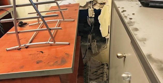 Από εκεί δούλεψαν με την άνεσή τους και με τα εργαλεία που διέθεταν κατάφεραν να ανοίξουν μια μεγάλη τρύπα στη μεσοτοιχία με το τουριστικό γραφείο, στο οποίο προκάλεσαν σοβαρές ζημιές.