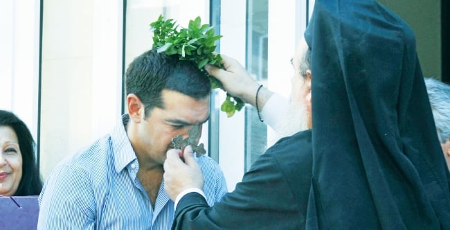 Σε αμηχανία έφερε τον πρόεδρο του ΣΥΡΙΖΑ Αλέξη Τσίπρα ο ιερέας που τελούσε τον αγιασμό στο 1ο ΕΠΑΛ Νέας Ιωνίας. Ο πανοσιολογιότατος αρχιμανδρίτης πατήρ Κωνσταντίνος Ψαλτάκης (Ι.Μ. Νέας Ιωνίας) ύψωσε τον σταυρό ευλογίας και άρχισε να ραίνει με τον δυόσμο τον κόσμο. Στη συνέχεια στρέφεται προς τον Αλέξη Τσίπρα, τον ραίνει με τον αγιασμό, ο Αλέξης σκύβει ελαφρώς μπροστά το κεφάλι και ο πατήρ Κωνσταντίνος του φέρνει τον σταυρό ευλογίας κοντά στο στόμα. Ο πρόεδρος του ΣΥΡΙΖΑ παραμένει ανέκφραστος, κλείνει τα μάτια -όπως μαρτυρούν οι φωτογραφίες-, τα χείλη του δεν κάνουν καμία σύσπαση, ενώ ο σταυρός και τα χέρια του ιερέα αγγίζουν τη μύτη του cool Αλέξη που δεν κάνει καμία κίνηση να ασπαστεί τον σταυρό. Ο Αλέξης δηλώνει ανένδοτος… Η αμηχανία κράτησε ελάχιστα δευτερόλεπτα και ο κ. Τσίπρας βρήκε και πάλι τους… ρυθμούς του. Αλλωστε έχει δηλώσει άθεος, έχει κάνει πολιτικό γάμο, δεν έχει βαπτίσει τα παιδιά του και χθες είδε ως ρουτίνα τον αγιασμό και απλώς δεν αντέδρασε τη στιγμή που τον έρανε ο ιερέας.