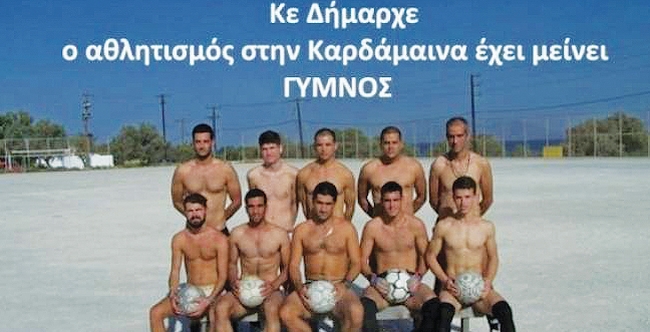 Εβγαλαν τις εμφανίσεις της ομάδας τους και ό,τι άλλο φορούσαν σε ένδειξη διαμαρτυρίας προς τον δήμαρχο Κω, επειδή -παρά τις υποσχέσεις του- δεν έχει τοποθετήσει ακόμη συνθετικό χλοοτάπητα στο γήπεδό τους. Ο λόγος για τους ποδοσφαιριστές του Αθλητικού Συλλόγου Δόξα Καρδάμαινας από την Κω, που φωτογραφήθηκαν… τσίτσιδοι καλύπτοντας τα ευαίσθητα σημεία τους μόνο με μια μπάλα ποδοσφαίρου! Σε ανακοίνωση που εξέδωσαν οι ποδοσφαιριστές της ομάδας, παραθέτουν τα γεγονότα που τους οδήγησαν στην τολμηρή φωτογράφιση, ενώ απευθυνόμενοι προς τον δήμαρχο κ. Καΐσερλη σημειώνουν χαρακτηριστικά: «Εχουμε αποφασίσει να έχουμε έναν πολύ θερμό χειμώνα. Σε σας απομένει να επιλέξετε αν θα ζεσταθούμε στο ανακαινισμένο γήπεδο της Καρδάμαινας ή αν θα ζεσταθούμε όλοι μαζί στην αίθουσα του δημοτικού συμβουλίου». Στην ανοιχτή επιστολή, την οποία υπογράφει ο πρόεδρος της ομάδας Κωνσταντίνος Καραναστάσης, αναφέρεται πως η διοίκηση, οι παίκτες, οι γονείς και οι φίλαθλοι του χωριού έχουν αποφασίσει να αγωνιστούν σθεναρά μέχρις ότου δουν τον χλοοτάπητα στο γήπεδό τους και τονίζεται: «Η προετοιμασία της ομάδας ξεκινά. Την πρώτη μέρα ξεκινήσαμε στα αγκάθια, τη δεύτερη το γήπεδο καθαρίστηκε από τα αγκάθια και την ένατη επιδιορθώθηκε ο σωλήνας. Να είμαστε ευγνώμονες, άραγε; Η υπομονή μας εξαντλήθηκε. Οι υποσχέσεις και τα δελτία Τύπου μάς αφήνουν πια αδιάφορους. Πλέον, κύριε δήμαρχε, δεν πιστεύουμε στα αυτιά μας. Πλέον πιστεύουμε μόνο στα μάτια μας».