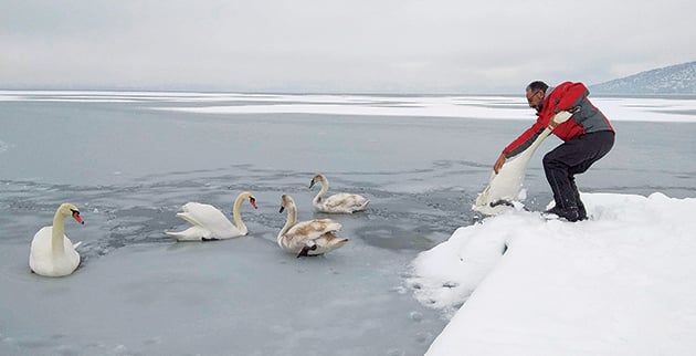 ❱❱ Σωτήρες δεκάδων πτηνών που πάγωσαν εξαιτίας των χαμηλών θερμοκρασιών στα νερά της λίμνης της Καστοριάς έγιναν τις τελευταίες ημέρες οι εθελοντές της τοπικής Εταιρίας Προστασίας Περιβάλλοντος. Οπως υποστηρίζει ο Νίκος Παναγιωτόπουλος, οι δεκάδες «φύλακες άγγελοι» έχουν διασώσει μέχρι στιγμής 17 μεγάλα πουλιά, όπως κύκνους, πελεκάνους και ερωδιούς, που κάθονται μέσα στο νερό τη νύχτα, αλλά, όταν αυτό παγώνει, τα πόδια τους εγκλωβίζονται και δεν μπορούν να κινηθούν.
