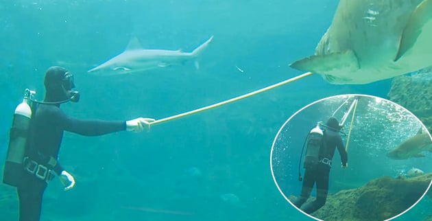 Για τον λόγο αυτόν, στις συγκεκριμένες δεξαμενές βουτάνε πάντα δύο άτομα, με το ένα εξ αυτών να καθαρίζει τις γυάλινες επιφάνειες και το άλλο να έχει τον ρόλο του άγρυπνου φρουρού, που κρατώντας στα χέρια ένα ξύλινο κοντάρι προσπαθεί να απομακρύνει τους καρχαρίες.