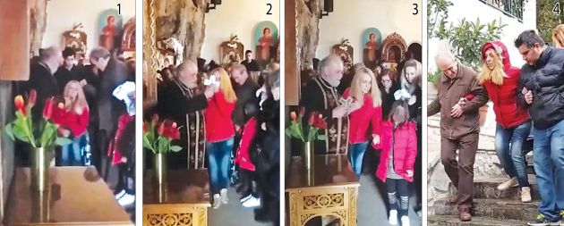 Στην αρχή του συγκλονιστικού βίντεο, το οποίο δημοσίευσε στο προφίλ της στο facebook η Πετρούλα Σερμέτη, διακρίνεται ο πατέρας Δημήτριος Λουπασάκης να «σταυρώνει» στο μέτωπο την ξανθιά κοπέλα, η οποία λίγα λεπτά νωρίτερα βρισκόταν καθηλωμένη σε ένα καροτσάκι, και να βαδίζουν μαζί προς την έξοδο της εκκλησίας!