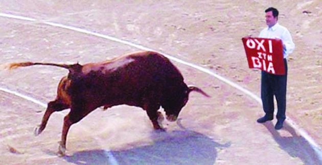 Η εικόνα είναι ιδιαίτερα γλαφυρή, καθώς ο Γιώργος Καμίνης βρίσκεται μέσα σε μια αρένα ως ταυρομάχος απέναντι από τον ταύρο, που είναι έτοιμος να του επιτεθεί και αυτός με το ήρεμο ύφος του κρατά θαρραλέα το κόκκινο πανί μπροστά στο τετράποδο.