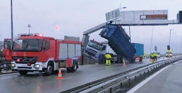 Λόγω των θυελλωδών ανέμων που έπνεαν στην περιοχή, η καρότσα του οχήματος… απογειώθηκε και «καρφώθηκε» στις πινακίδες σήμανσης της γέφυρας «Χ. Τρικούπης»! Από το ατύχημα δεν υπήρξαν τραυματίες, όμως διακόπηκε η κυκλοφορία στο ρεύμα προς Πάτρα, ώσπου να απομακρυνθεί η νταλίκα.