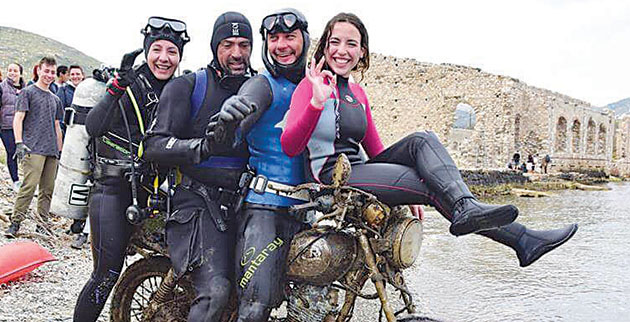 Μάλιστα, τέσσερις από τους εθελοντές που συμμετείχαν στον παράκτιο και υποβρύχιο καθαρισμό δεν δίστασαν να ανέβουν στη σκουριασμένη μοτοσικλέτα και να βγάλουν φωτογραφία… τετρακάβαλο!
