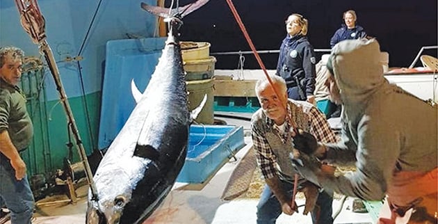 ❱❱ Ως ο μεγαλύτερος τόνος που ψαρεύτηκε ποτέ στα νερά του Αιγαίου καταγράφεται ο ερυθρός blue fin tuna (γαλαζόπτερος), που αλίευσαν τη Μεγάλη Παρασκευή δύο επαγγελματίες ψαράδες στη θαλάσσια περιοχή της Νάξου. Οπως έγινε γνωστό, τα αδέλφια Μακαρούνα είχαν πάει για ψάρεμα με το αλιευτικό σκάφος τους «Κάλυμνος», όταν στα δίχτυα τους πιάστηκε ο τόνος-γίγας, ο οποίος μετά τις απαραίτητες μετρήσεις διαπιστώθηκε πως είχε μήκος 2,74 μ. και βάρος 288 κιλά. Κατά την επιστροφή τους ενημερώθηκαν όλες οι αρμόδιες Αρχές, που ανέλαβαν τις διαδικασίες αρχειοθέτησης, ενώ οι κάτοικοι της Νάξου που βρέθηκαν εκεί δεν πίστευαν στα μάτια τους όταν αντίκρισαν από κοντά των τεράστιων διαστάσεων ψάρι.