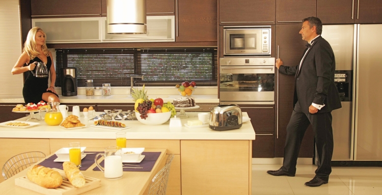 Σύμφωνα με το σενάριο, οι παρουσιαστές, παρά το «black tie», είναι πανέτοιμοι να σερβίρουν πρωινό. Η Φαίη περιμένει πάνω από την καφετιέρα να ετοιμαστεί ο καφές, ενώ ο Γιώργος βρίσκεται μπροστά στον πάγκο με τα καλούδια. Οταν ο παρουσιαστής ζητεί από τη σύζυγό του να του δώσει το μαχαίρι, εκείνη σαν άλλη… Αντζελίνα Τζολί στην ταινία «Mr. and Mrs. Smith» του το πετάει και το καρφώνει στο ντουλάπι μπροστά του. Εκείνος, εντελώς ατάραχος, το παίρνει και αλείφει στο ψωμί του λίγη μαρμελάδα. Στη συνέχεια, η Φαίη Σκορδά παίρνει τον καφέ της και κάθεται στο τραπέζι απέναντι από τον σύζυγό της. Είναι η σειρά του Γιώργου Λιάγκα για την κίνηση… εντυπωσιασμού, αφού στην επιθυμία της κυρίας του να φάει φρούτο, το τεμαχίζει με τρόπο ζογκλερικό! Οπως μας αποκάλυψε ο σκηνοθέτης Νικόλας Αλαβάνος, το ζευγάρι απόλαυσε τα γυρίσματα, εν μέσω γέλιων και αστείων.