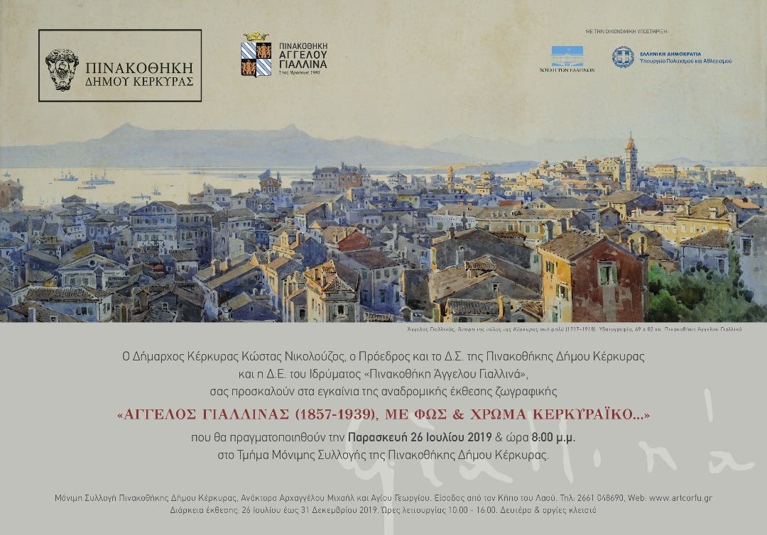 Η Δημοτική Πινακοθήκη Κέρκυρας και το Ίδρυμα “Πινακοθήκη Άγγελου Γιαλλινά”, συνδιοργανώνουν αναδρομική έκθεση ζωγραφικής με έργα του κορυφαίου Έλληνα υδατογράφου…… και έχουν τη χαρά να σας προσκαλέσουν στα εγκαίνια, που θα πραγματοποιηθούν την Παρασκευή 26 Ιουλίου 2019 και ώρα 20.00, στο Τμήμα Μόνιμης Συλλογής της Πινακοθήκης Δήμου Κέρκυρας.