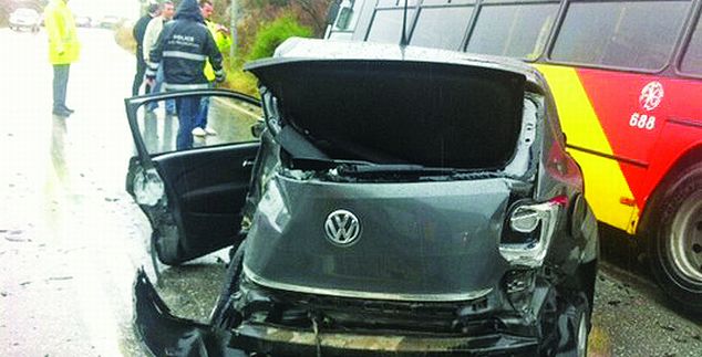 Ωστόσο, ο οδηγός ενός άλλου λεωφορείου της ίδιας γραμμής 58, με αριθμό 685, που ερχόταν από την αντίθετη κατεύθυνση, δεν πρόλαβε να αντιδράσει και συγκρούστηκε μετωπικά με το Ι.Χ. του στρατιώτη. Το λεωφορείο δίπλωσε και το αυτοκίνητο στο οποίο επέβαινε ο 23χρονος μετατράπηκε σε άμορφη μάζα σιδερικών. Στον τόπο της σύγκρουσης -στο ύψος του Μοναστηρίου- επικράτησε πανδαιμόνιο επί αρκετές ώρες, αφού τα οχήματα είχαν κλείσει τον δρόμο και οι άνδρες της Τροχαίας διέκοψαν την κυκλοφορία και στις δύο λωρίδες, με αποτέλεσμα να δημιουργηθεί κυκλοφοριακό χάος. Ο άτυχος 23χρονος ανασύρθηκε νεκρός από το διαλυμένο αυτοκίνητό του, ενώ τα ασθενοφόρα που έφτασαν με πολλή δυσκολία στο σημείο του δυστυχήματος μετέφεραν εσπευσμένα στο Νοσοκομείο Παπαγεωργίου τον οδηγό του λεωφορείου και τρεις επιβάτες που τραυματίστηκαν από τη μετωπική σύγκρουση. Σε όλους παρασχέθηκαν οι πρώτες βοήθειες και αποχώρησαν.