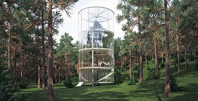 Εμπνευστής του πρωτοποριακού σπιτιού είναι ο αρχιτέκτονας Αϊμπέκ Αλμαζόφ, ο οποίος περικύκλωσε ένα έλατο ύψους 13 μέτρων με γυάλινους τοίχους σε δάσος του Καζακστάν. Η πρόθεση πίσω από τη διαφανή αρχιτεκτονική δομή, η οποία βρίσκεται κρυμμένη ανάμεσα σε ψηλά έλατα, ήταν να γίνει ενσωμάτωση του βιομηχανικού σχεδίου με τη φύση παραλείποντας ορισμένες περιττές λεπτομέρειες. Το τετραώροφο δεντρόσπιτο, με το έλατο στη μέση, κόστισε 283.000 ευρώ και χτίστηκε κατόπιν παραγγελίας επιχειρηματία. Ολη η κατασκευή του στηρίζεται σε τέσσερις μεταλλικούς στύλους, οι οποίοι με τη σειρά τους υποστηρίζουν κάθε όροφο, μαζί με την ελικοειδή σκάλα που συνδέει τα επίπεδα μεταξύ τους. Το σπίτι περιβάλλεται από τοίχους αποτελούμενους από διπλά τζάμια. Ο αρχιτέκτονας, ο οποίος πέρασε πέντε μήνες μέχρι να τελειώσει την κατασκευή του, λέει ότι σκοπός του έργου είναι να προσφέρει μια εναλλακτική λύση στην πολύβουη ζωή της πόλης και των ασφυκτικών αστικών δομών με τη σύντηξη ενός προστατευτικού σπιτιού και ενός φυσικού περιβάλλοντος χωρίς να δημιουργείται οπτικός διαχωρισμός.
