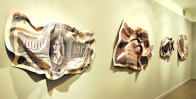 Ετσι, βλέπουμε δραχμές που καλύπτουν καρέκλες, αλλά και χαρτονομίσματα που έγιναν μπουκέτα, ακόμη και περιτυλίγματα σε συσκευασίες.