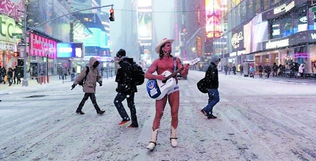 Με αυτή τη θεομηνία λοιπόν η ζωή στην Times Square δεν σταματά. Μπορεί να είναι αισθητά μειωμένη η προσέλευση των τουριστών, οι σταθεροί χαρακτήρες της όμως δεν το βάζουν κάτω και κάνουν το show τους. Πρώτος και καλύτερος ο γυμνός καουμπόι που αψηφώντας το κρύο, πετάει το καλογυμνασμένο του κορμί φόρα παρτίδα και… παρέα με τις μπότες του και την κιθάρα του τραβά τα γυναικεία βλέμματα και τα δολάρια που τολμηρές κυρίες του βάζουν στο εσώρουχο!