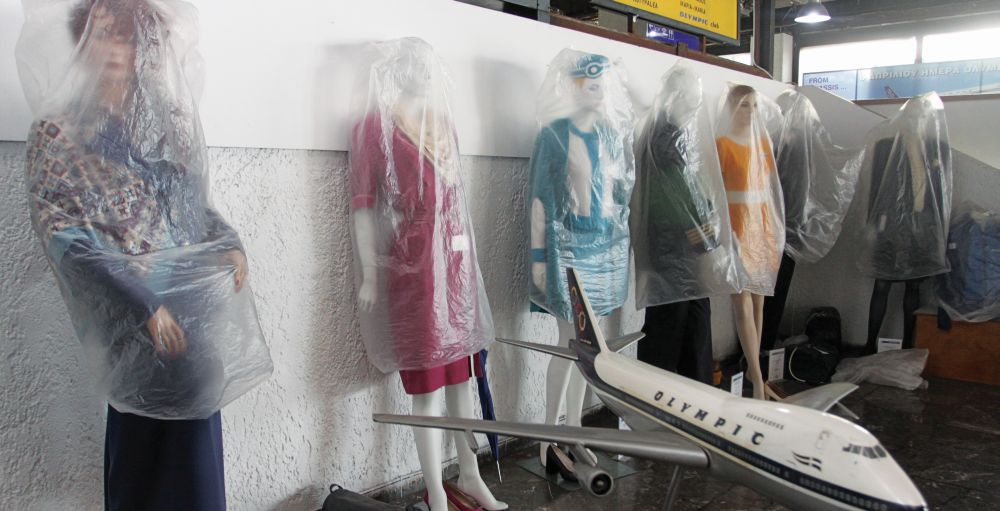 αιχμαλωτίζουν επάνω στο κιτρινισμένο από τον χρόνο χαρτί ένδοξες στιγμές του παρελθόντος, ενώ λίγο πιο πέρα παραταγμένα μέσα σε γυάλινες προθήκες σώζονται όργανα από το πιλοτήριο. Δύο από τα καθίσματα της πρώτης θέσης βρίσκονται σε μια γωνιά σαν να περιμένουν τους επόμενους επιβάτες. Πίσω από μερικά τεράστια κιγκλιδώματα που είναι δεμένα με συρματόσχοινο φυλάσσονται ανεκτίμητης αξίας εκθέματα: «Τα έχουμε μαζέψει με μεγάλο κόπο για να τα βρουν οι νεότερες γενιές» εξηγεί η Τζένη Κονίδη, ένα από τα ιδρυτικά μέλη του ΠΟΛΚΕΑ, και μας ξεναγεί με δάκρυα στα μάτια. «Βλέπετε, είχαμε βλέψεις πως αυτός εδώ ο χώρος θα λειτουργούσε σαν μουσείο. Τελικά ρημάζει. Χωρίς εμάς δεν θα είχε μείνει τίποτα όρθιο» λέει η κυρία Κονίδη και εξηγεί: «Το 2011 είχαν γίνει τα εγκαίνια παρουσία αρκετών προσωπικοτήτων. Οπως βλέπεται, κανείς άλλος εκτός από τους υπαλλήλους της παλιάς Ολυμπιακής δεν ενδιαφέρεται». Σε περίοπτη θέση βρίσκονται παρατεταμένες κούκλες με όλες τις στολές των αεροσυνοδών της Ολυμπιακής. Ολες είναι κουκουλωμένες με νάιλον σακούλες προκειμένου να μη φθαρούν από τη σκόνη. «Είναι στολές που μας έχουν χαρίσει παλιές αεροσυνοδοί. Μία από κάθε εποχή. Βλέπετε, στα χρόνια του Ωνάση οι στολές ήταν υψηλής ραπτικής. Τα πληρώματα της Ολυμπιακής ήταν από τα πιο καλοντυμένα» εξηγεί η κυρία Κονίδη.
