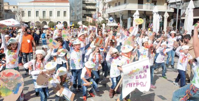 Με το σύνθημα «Μες στην τρελή αποκριά βάζω κι εγώ μια πινελιά» χιλιάδες μικροί καρναβαλιστές έστειλαν χθες από την Πάτρα το μήνυμα της χαράς, της ζωής και της ελπίδας. Στη μεγάλη παρέλαση των μικρών, που πραγματοποιείται κάθε χρόνο την προτελευταία Κυριακή της Αποκριάς, συμμετείχαν οκτώ χιλιάδες πιτσιρίκια ντυμένα με τις πιο εντυπωσιακές στολές. Την παρέλαση άνοιξε η μπαντίνα του δήμου της Πάτρας, ενώ  ακολούθησαν ο Τζίτζικας, που ήταν η μασκότ του καρναβαλιού των μικρών, και η ομάδα του θεάτρου δρόμου X-Saltibagos, πλαισιωμένοι από επτά άρματα, καθώς και ένα μουσικό άρμα.