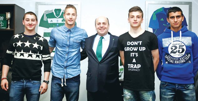 Την επεκτατική πολιτική του απέναντι στο «αύριο» της ομάδας συνεχίζει ο Παναθηναϊκός, ο οποίος σε μια συμβολική (περισσότερο) κίνηση έκανε επαγγελματίες εννέα παίκτες των τμημάτων υποδομής. Παρουσία του Γιάννη Αλαφούζου και του Νίκου Νταμπίζα οι νεαροί Γκέκας, Κότσαρης, Μυρθιανός, Τζανουλίνος, Αγγελόπουλος, Νιούμαν, Στάικος, Μαλντίν και Λάμπρου υπέγραψαν χθες συμβόλαιο για 2,5 χρόνια απολαμβάνοντας τα προνόμια ενός επαγγελματία ποδοσφαιριστή κι έχοντας πλέον το κίνητρο για να εξελιχθούν και να «ανέβουν» στην πρώτη ομάδα.