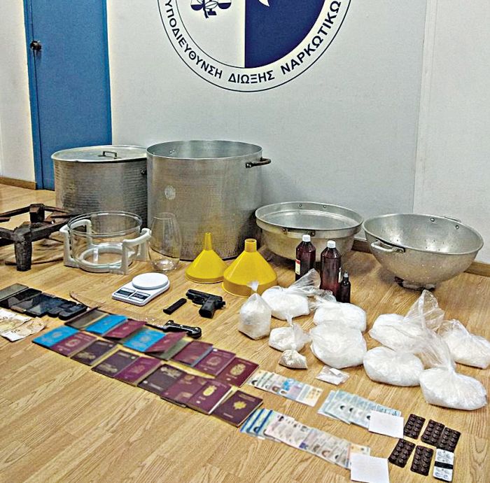 Κατά τη διάρκεια της έρευνας που διενεργήθηκε χθες το πρωί εντοπίστηκαν και κατασχέθηκαν περίπου 3,5 κιλά κρυσταλλικής μεθαμφεταμίνης, 60 χάπια μεθαδόνης, τρία πλαστικά δοχεία με υγρό και 50 γραμμάρια σκόνη άγνωστης χημικής σύστασης, καθώς και όλος ο εργαστηριακός εξοπλισμός για την παρασκευή του επικίνδυνου ναρκωτικού shisha.