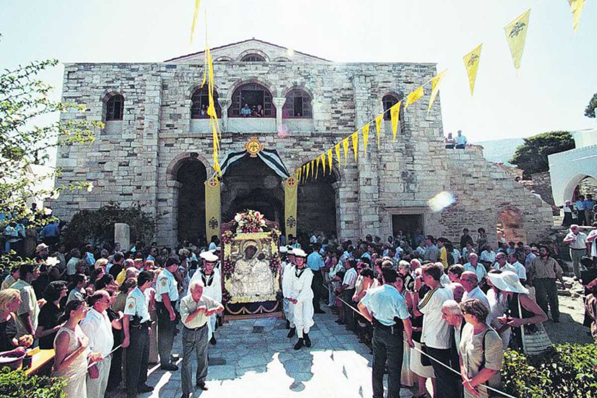 Ένα από τα σημαντικότερα προσκυνήματα της Ορθοδοξίας είναι ο παλαιοχριστιανικός ναός της Εκατονταπυλιανής στην Παροικιά της Πάρου. Χιλιάδες πιστοί επισκέπτονται κάθε χρόνο το νησί για να προσκυνήσουν τη θαυματουργή εικόνα του 17ου αιώνα, αλλά και να συμμετάσχουν στις εορταστικές εκδηλώσεις. Δεκάδες καΐκια καταφθάνουν στο λιμάνι, με τους πιστούς μέσα σε αυτά να κρατούν αναμμένα δαδιά. Ένα έθιμο που σε κάνει κοινωνό ενός μοναδικού φαντασμαγορικού θεάματος.