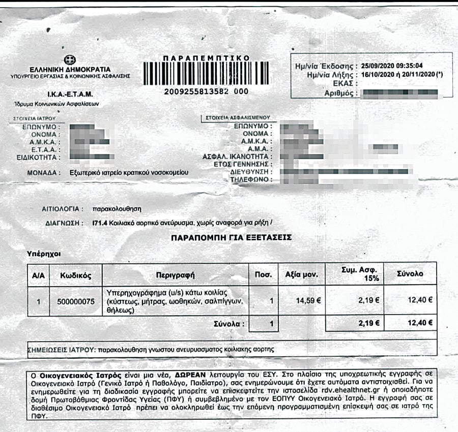 Ο ασθενής πήγε σε ιδιωτικό κέντρο για την εξέταση, καθώς ήταν αδύνατον να την κάνει στο νοσοκομείο, όμως εκεί διαπίστωσε πως το παραπεμπτικό που του δόθηκε ήταν για υπερηχογράφημα κάτω κοιλίας με την υποσημείωση για εξέταση κύστεως και ωοθηκών. Το αποτέλεσμα ήταν να μην μπορέσει να εξυπηρετηθεί, καθώς δεν είχε το σωστό παραπεμπτικό και έφυγε από το ιδιωτικό κέντρο εμφανώς εξαγριωμένος, με το χαρτί στο χέρι!