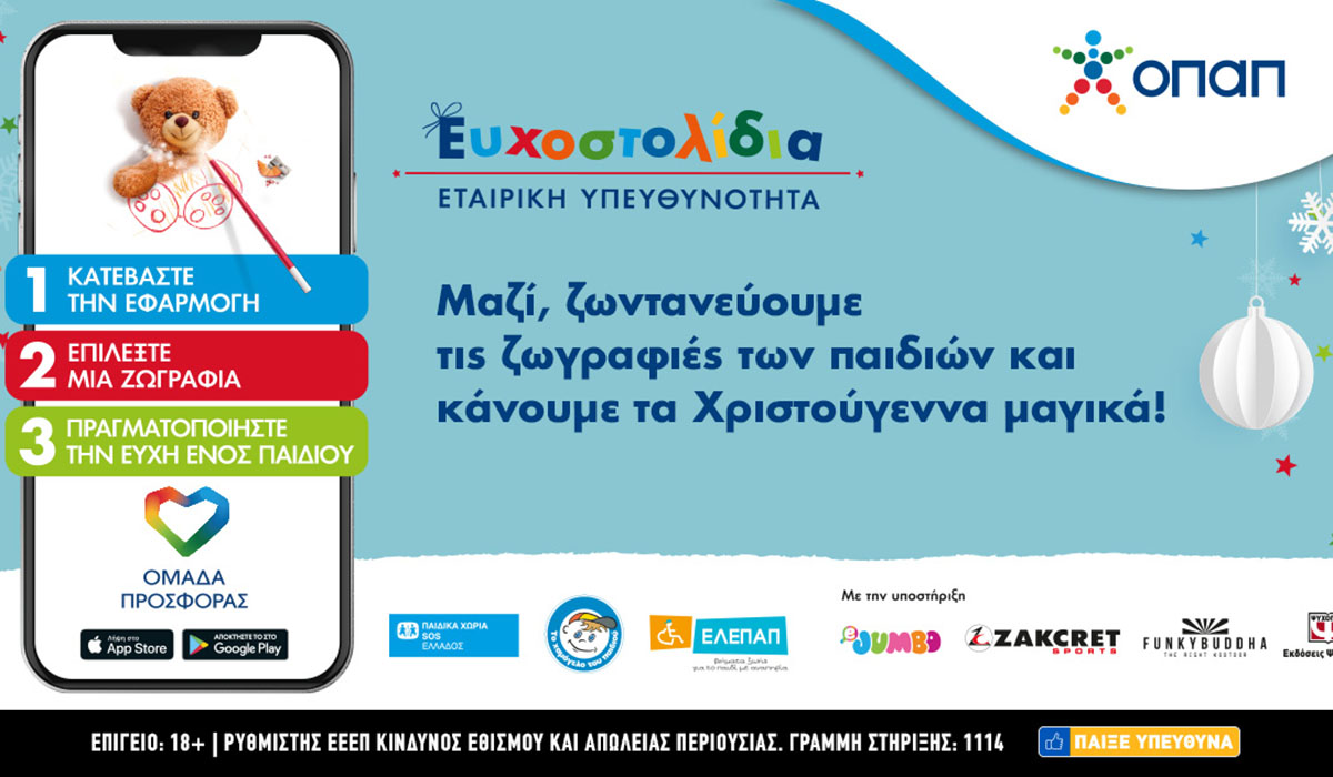 Στη δράση Ευχοστολίδια, που υλοποιείται από τον ΟΠΑΠ για έβδομη χρονιά, μπορούμε να συμμετάσχουμε όλοι μας από το σπίτι και – μέσω υπολογιστή, κινητού τηλεφώνου ή tablet – να κάνουμε πραγματικότητα μία ή και περισσότερες παιδικές ευχές.