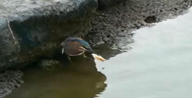 Με μια αρκετά έξυπνη τεχνική,που θυμίζει ανθρώπινη νοημοσύνη ένα πουλί χρησιμοποιεί για δόλωμα μια φέτα ψωμί που το πεάει στη θάλασσα για να τσιμπήσουν τα ψάρια.
