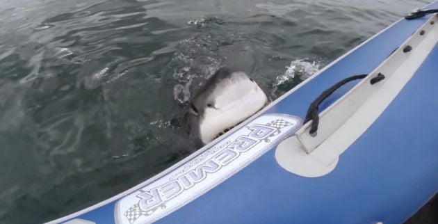 Παρακολουθήστε την επίθεση ενός λευκού καρχαρία σε φουσκωτό σκάφος δυτών, που κατέγραψε ερασιτεχνική κάμερα. Ο καρχαρίας έκοψε με τα σαγόνια του τμήμα του σκάφους και στη συνέχεια απομακρύνθηκε.