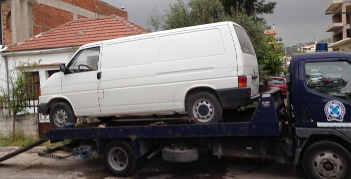 Το λευκό βανάκι, που είχε κλαπεί από τον Ασσο Κορινθίας, ήταν σταθμευμένο στη Μάνδρα απέναντι από μια καφετέρια. Οι αστυνομικοί εντόπισαν το ύποπτο όχημα έπειτα από τηλεφώνημα κατοίκου της περιοχής, ο οποίος έβλεπε εδώ και 4-5 μέρες σταθμευμένο το λευκό βαν, χωρίς όμως κανείς να έχει πάει να το πάρει.