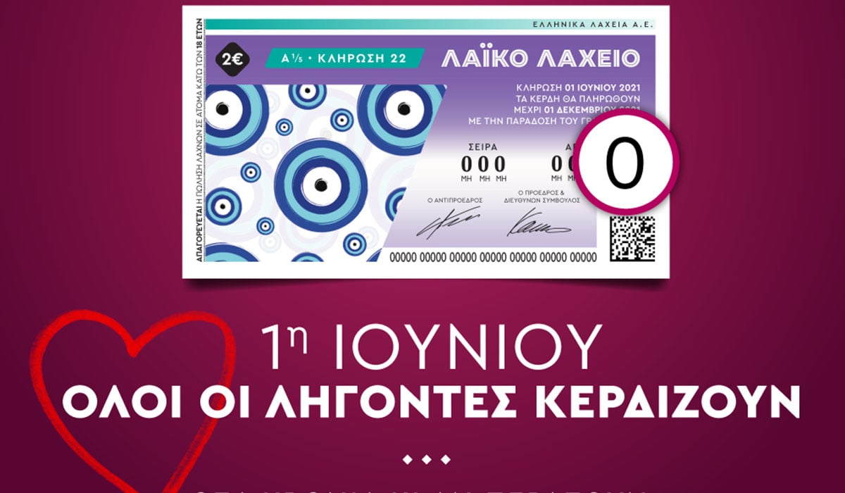 Σίγουρα κέρδη 5 ευρώ σε κάθε πεντάδα θα μοιράσει την Τρίτη 1 Ιουνίου η κλήρωση του Λαϊκού Λαχείου. Πρόκειται για μια κλήρωση στην οποία «Όλοι οι λήγοντες κερδίζουν», δηλαδή όλοι οι παίκτες θα πάρουν πίσω τουλάχιστον το 50% των χρημάτων τους για κάθε πεντάδα. Ακόμη και αν δεν πετύχουν τον πρώτο ή το δεύτερο νικηφόρο λήγοντα (+1), που κερδίζουν 20 και 10 ευρώ αντίστοιχα, θα πάρουν πίσω σίγουρα 5 ευρώ.