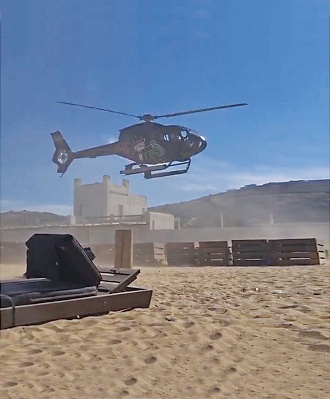 Από το ελικόπτερο αποβιβάστηκαν ο ιδιοκτήτης και χειριστής Βασίλης Χήτος και ο φίλος του, ο εφοπλιστής Βασίλης Μιχαήλ, οι οποίοι θέλησαν να απολαύσουν το γεύμα τους στο συγκεκριμένο beach bar χωρίς να κάνουν βήμα.