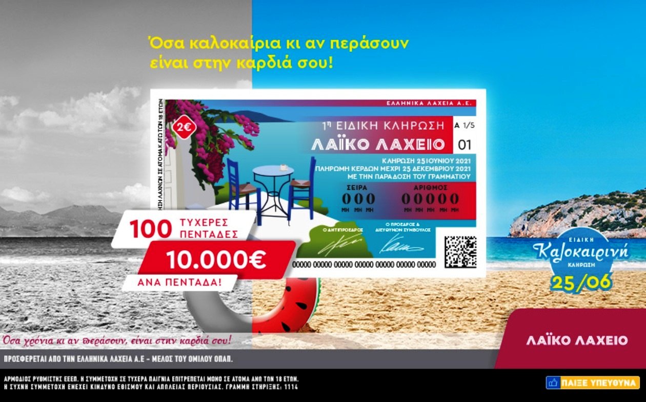 Το Λαϊκό Λαχείο μπαίνει δυναμικά στο καλοκαίρι, με μια ειδική κλήρωση που θα μοιράσει 10.000 ευρώ σε 100 τυχερούς παίκτες και πολλά άλλα έπαθλα.