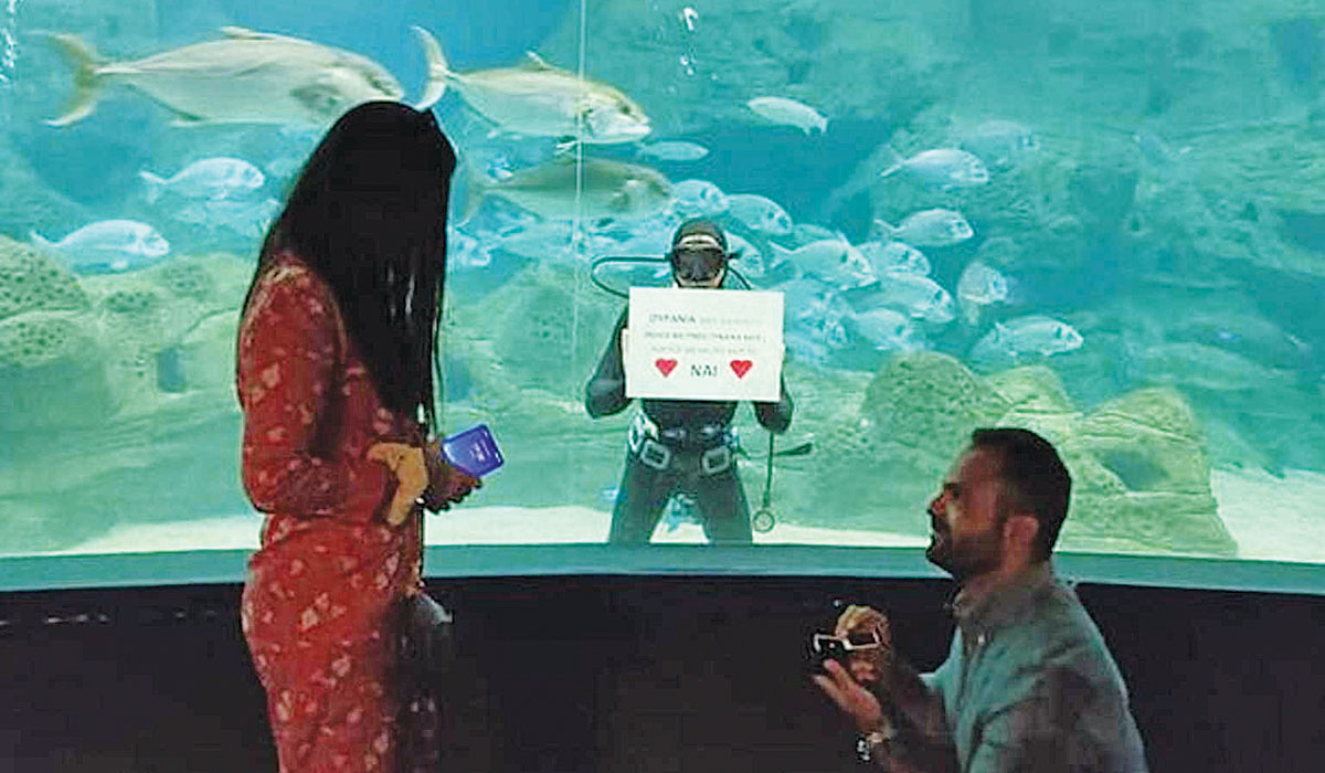 Μέχρι και ο δύτης επιστρατεύτηκε για να εισπράξει ο μέλλων γαμπρός το πολυπόθητο «ναι», που γονατιστός προσέφερε το δαχτυλίδι στην αγαπημένη του. Ο λόγος για τον Γιώργο και την Ουρανία, ένα νέο ζευγάρι που αντήλλαξε υποσχέσεις για μια ευτυχισμένη κοινή ζωή.
