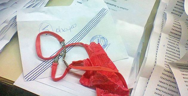 Ενα κόκκινο στρινγκ με… δαντέλα και Swarovski λεπτομέρειες αντίκρισαν μέσα σε έναν από τους φακέλους των ψηφοφόρων τα μέλη της εφορευτικής επιτροπής σε εκλογικό τμήμα της Κρήτης! Η κίνηση της γυναίκας ή του άνδρα, που με αυτό τον τρόπο θέλησε να εκφράσει την οργή της/του για τους πολιτικούς και την κατάσταση που επικρατεί στη χώρα, άφησε άφωνους τους ανθρώπους που κλήθηκαν να καταμετρήσουν τις ψήφους των Κρητικών στις δημοτικές και περιφερειακές εκλογές της περασμένης Κυριακής, αλλά και τον δικαστικό αντιπρόσωπο που βρισκόταν εκεί. Την αρχική έκπληξη ακολούθησαν ασυγκράτητα γέλια, μια και η συγκεκριμένη περίπτωση ξεπέρασε κάθε φαντασία.