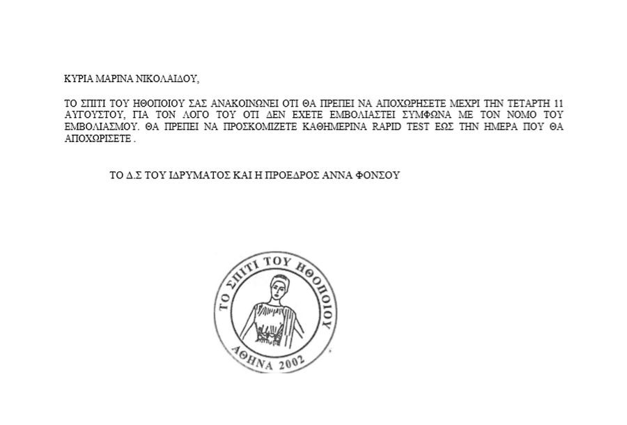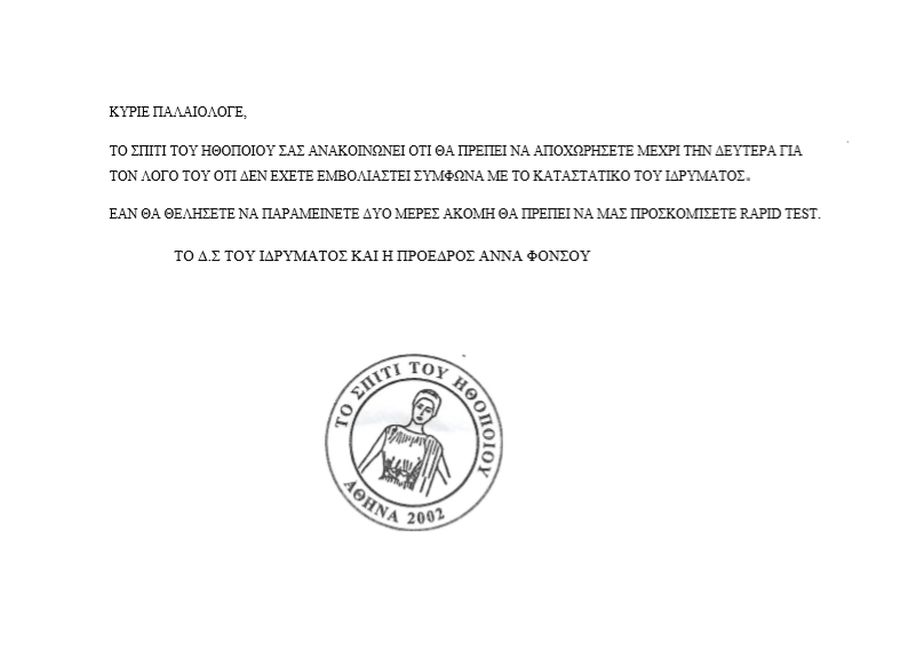 «Επί μισή ώρα μιλούσα με τον κύριο Γιώργο Παλαιολόγου και την κυρία Μαρίνα Νικολαΐδη, οι οποίοι μου επιβεβαίωσαν τις πιέσεις και τους εκβιασμούς για έξωσή τους από το Σπίτι εφόσον δεν δέχονται άνευ συναίνεσης να εμβολιαστούν. Ζητώ να αρθεί το απόρρητο των επικοινωνιών μου για να επιβεβαιωθούν πλήρως οι καταγγελίες των δύο καλλιτεχνών, οι οποίοι μου περιέγραψαν την υφιστάμενη κατάσταση. Ο κύριος Παλαιολόγος, ο οποίος έχει υποστεί επέμβαση καρδιάς και πάσχει από διαβήτη, είναι 63 ετών και έλαβε το μήνυμα ότι φεύγει σε δύο μέρες εφόσον δεν εμβολιαστεί. Επίσης μου ανέφερε ότι είχε μια συνομιλία με την κυρία Φόνσου στην οποία εξέφρασε τη διαμαρτυρία του λέγοντας: “Αννα, δεν σε σέβομαι πλέον”. Η κυρία Μαρίνα Νικολαΐδη, η οποία βοηθούσε όσο μπορούσε στη λειτουργία του Σπιτιού, ήταν δίπλα στον κ. Παλαιολόγο. Με καλημέρισε και μου είπε: “Γιώργο, δεν έχεις γράψει τίποτα ψέματα”» αποκαλύπτει ο Γιώργος Τράγκας και συνεχίζει: