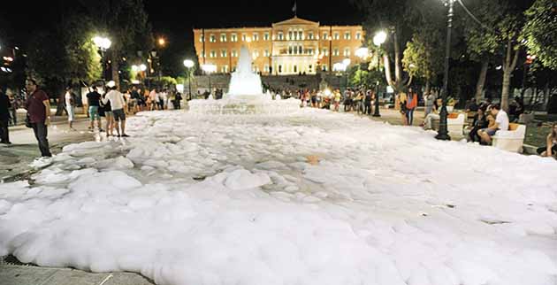 Και ξαφνικά η πλατεία Συντάγματος γέμισε αφρούς! Χωρίς να τους αντιληφθεί κάποιος, άγνωστοι έριξαν… απορρυπαντικό στο συντριβάνι, με αποτέλεσμα να πλημμυρίσει η σαπουνάδα και να καλύψει μεγάλο μέρος της πλατείας, στην οποία βρισκόταν και το εκλογικό κέντρο του Γ. Καμίνη! Κάποιοι απέδωσαν το περιστατικό σε νεαρούς που είχαν συγκεντρωθεί εκεί, ενώ οι πιο κακεντρεχείς έκαναν πικρόχολα σχόλια. Αλλοι έλεγαν ότι ο δήμαρχος Αθηναίων αποφάσισε να… καθαρίσει την κεντρική πλατεία της πόλης ανήμερα τη διεξαγωγή των δημοτικών εκλογών, σε μια ύστατη προσπάθεια να μην χάσει τον θώκο και άλλοι ότι το Σύνταγμα… άφρισε από το κακό του.