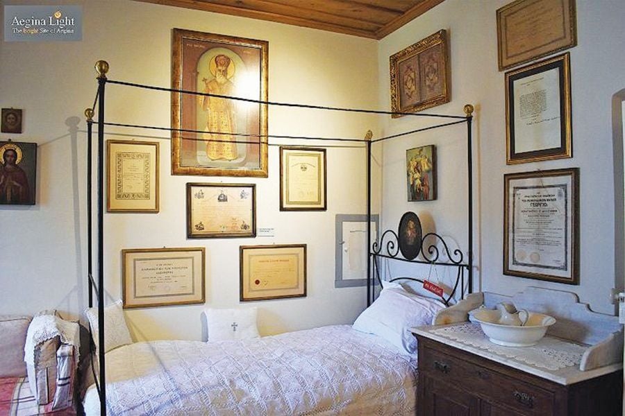 Η ηγουμένη Τιμοθέη ξεκίνησε την παρουσίαση από το γραφείο του αγίου χαρακτηριζοντάς το «ατόφιο», όπως το είχε στη Ριζάρειο, όπου δίδασκε. «Οταν ήρθε στην Αίγινα το έφερε μαζί του. Πάνω σ’ αυτό είναι τοποθετημένη η διαθήκη του, που είναι χειρόγραφη. Οι επισκέπτες μπορούν να βλέπουν τα γράμματα και τον καλλιγραφικό του χαρακτήρα. Μπορεί να δει κανείς τα βιβλία που διάβαζε, τα έπιπλα και τις καρέκλες που χρησιμοποιούσε, τα προσωπικά του αντικείμενα. Την τσάντα που χρησιμοποιούσε στη Ριζάρειο, τις παντόφλες του, που τις είχε φτιάξει ο ίδιος. Εφτιαχνε μάλιστα και στις μοναχές παρόμοιες» ανέφερε χαρακτηριστικά προς τους επισκέπτες της!