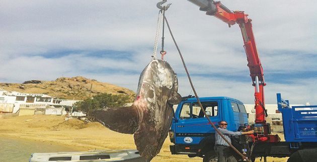 Με γερανό έβγαλαν το τεράστιο φεγγαρόψαρο (250 κιλών!) που έπιασε Μυκονιάτης